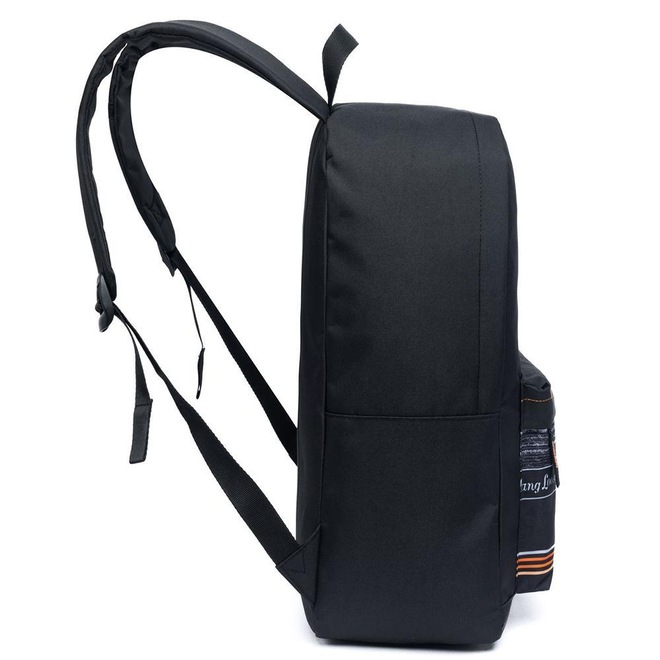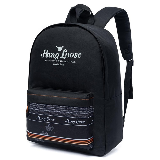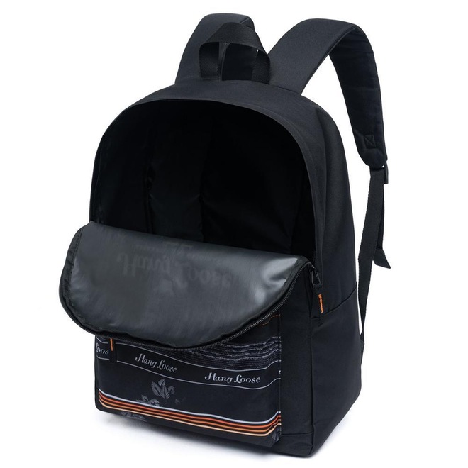 Mochila Hang Loose com compartimento principal, compartimento frontal, estampa frontal e etiquetas personalizadas.
