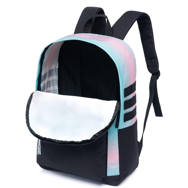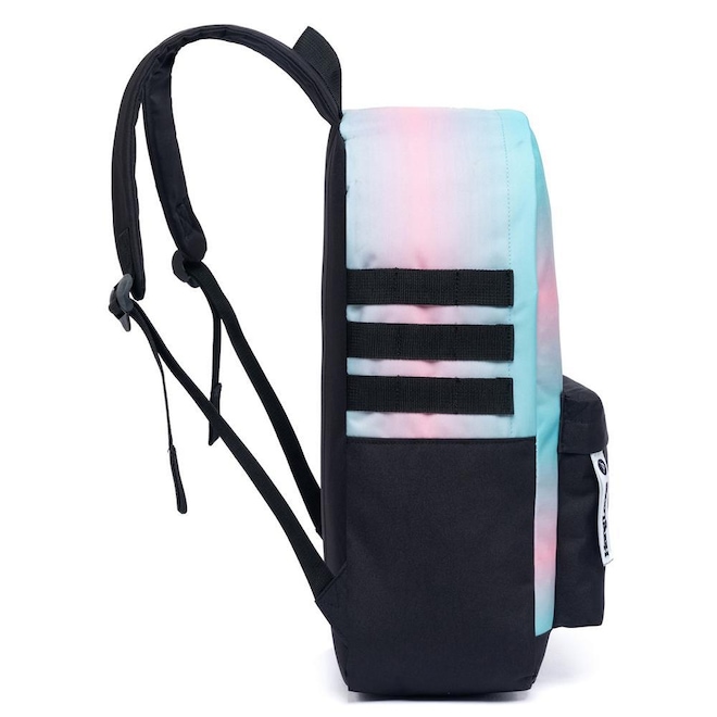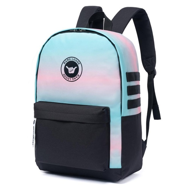 Mochila Hang Loose com compartimento principal, compartimento frontal, estampa frontal e etiquetas personalizadas.