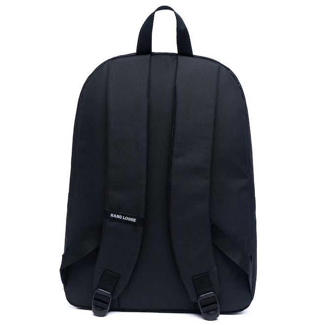 Mochila Hang Loose com compartimento principal, compartimento frontal, estampa frontal e etiquetas personalizadas.