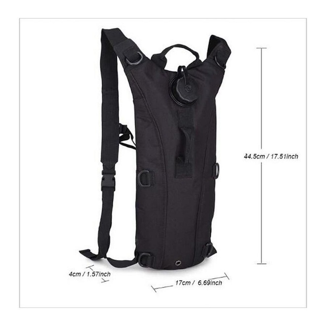 Especificações: Capacidade: 2.5L; Tamanho: 44,5x17 cm; Material da mochila: Nylon 600D; Material do Refil: TPU + PVC.