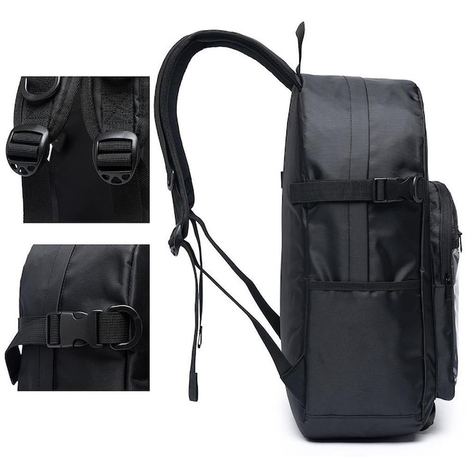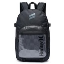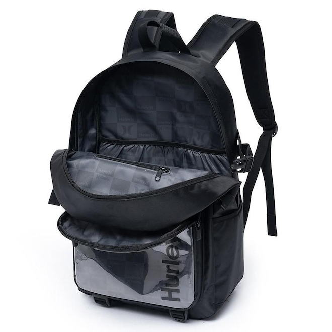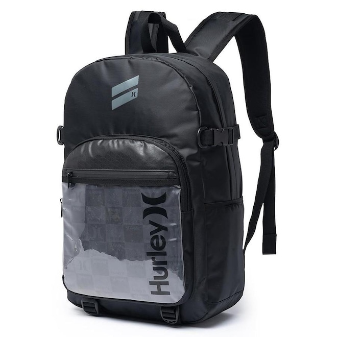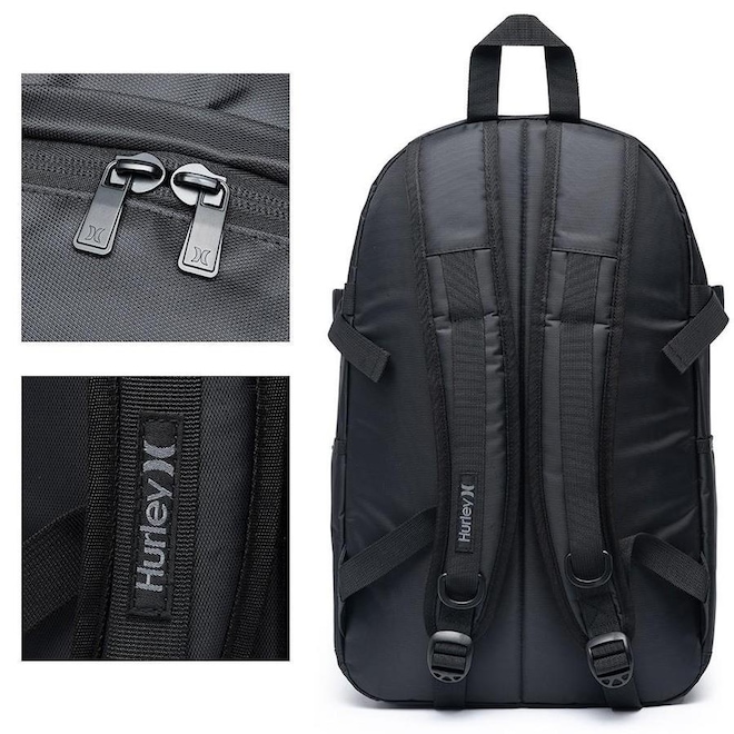 Mochila Hurley com tecido de poliéster 600D e 900D, compartimento para notebook até 17", compartimento principal grande, um compartimento frontal com fechamento em zíper e bolsos laterais.