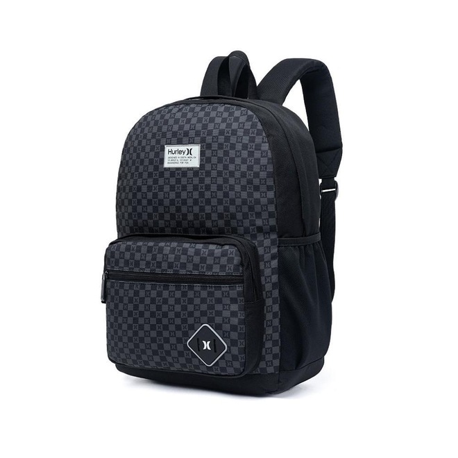 Mochila Hurley com compartimento principal, compartimento frontal, espaço para notebook até 15,6", alça ajustável, estampa frontal e etiquetas personalizadas.