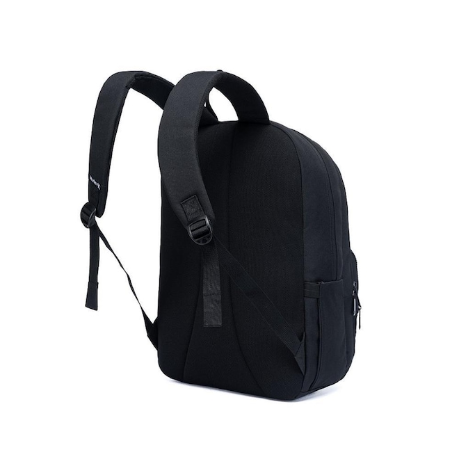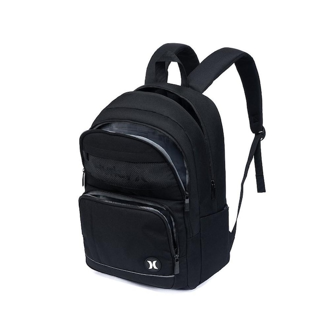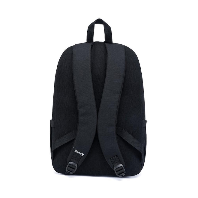 Mochila Hurley com compartimento principal, dois compartimentos frontais, espaço para notebook até 15,6", alça ajustável, estampa frontal e etiquetas personalizadas.