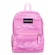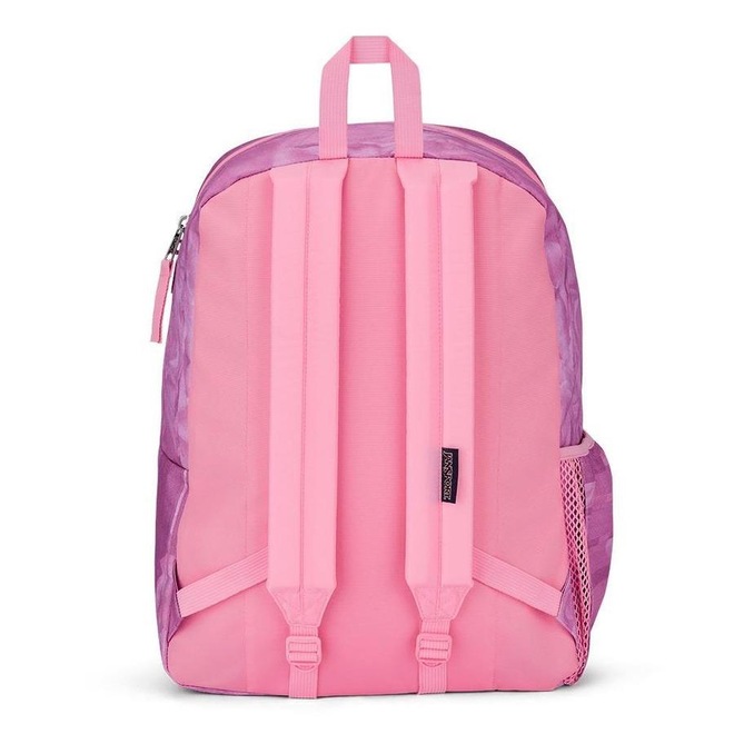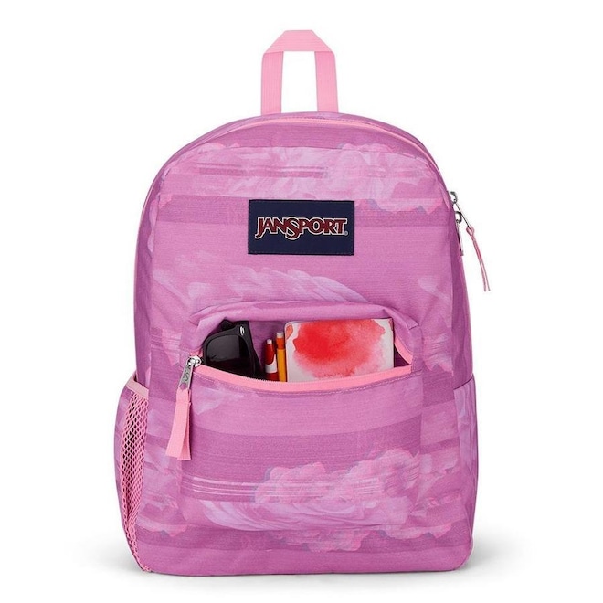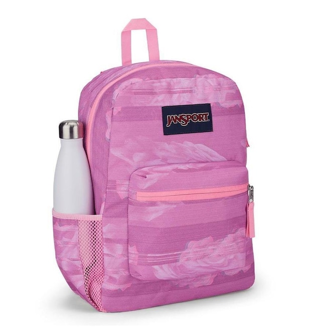 A mochila JanSport Cross Town é feita em poliéster 600 fios, sendo parte poliéster reciclado.