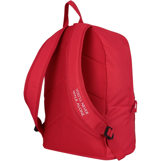 Possui estampa personalizada do Liverpool, suas alças traseiras são reguláveis e seu fechamento é em zíper.