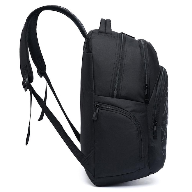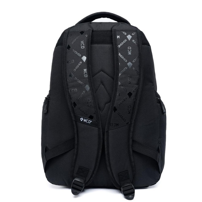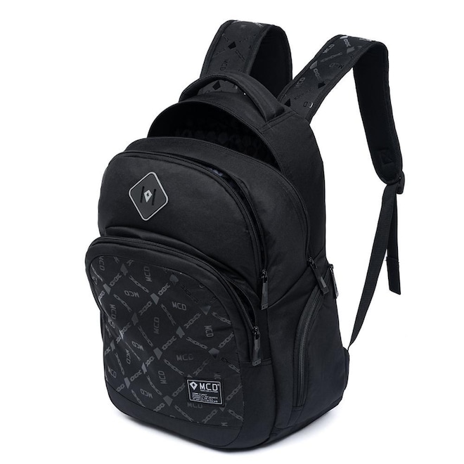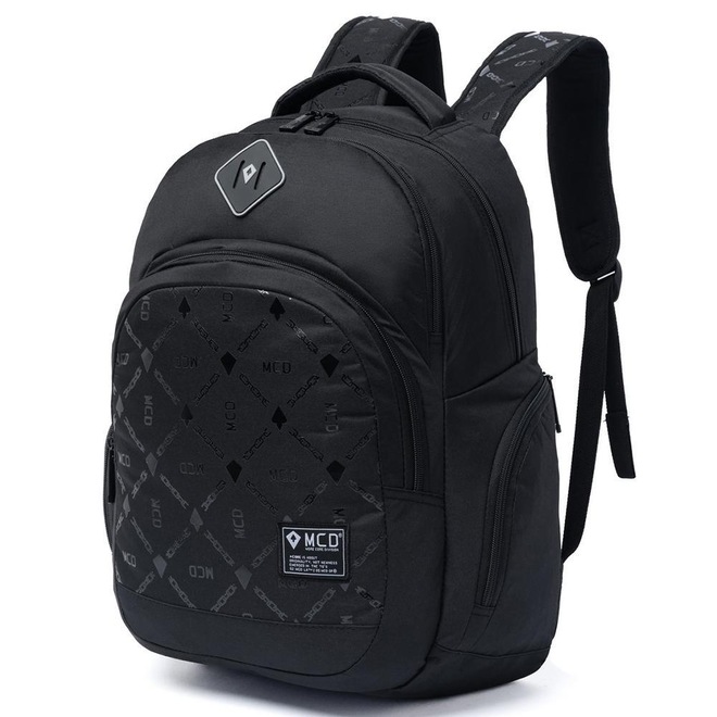 Mochila MCD com compartimento principal, compartimento frontal, espaço para notebook até 15,6", bordado frontal e etiquetas personalizadas.