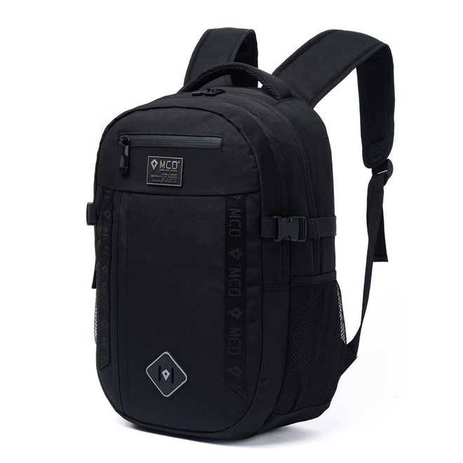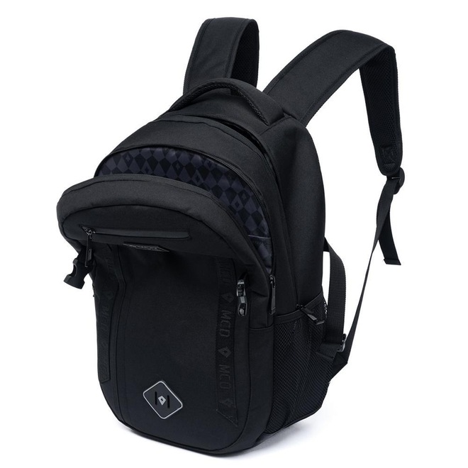 Mochila MCD com compartimento principal, compartimento frontal, espaço para notebook até 15,6", logo frontal e etiquetas personalizadas.