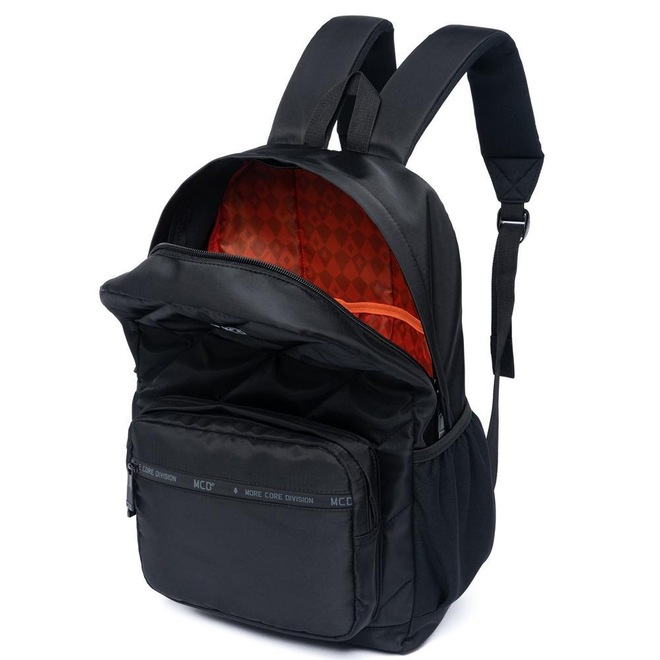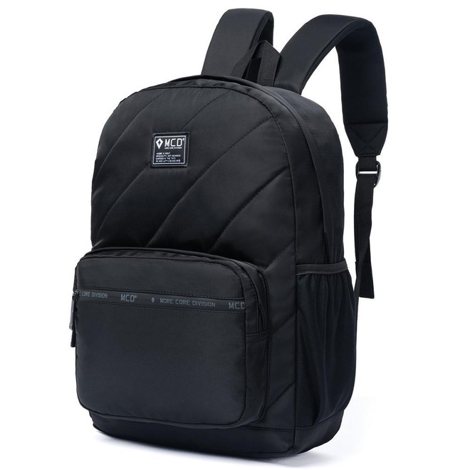 Mochila MCD com compartimento principal, compartimento frontal, espaço para notebook até 15,6", bordado frontal e etiquetas personalizadas.