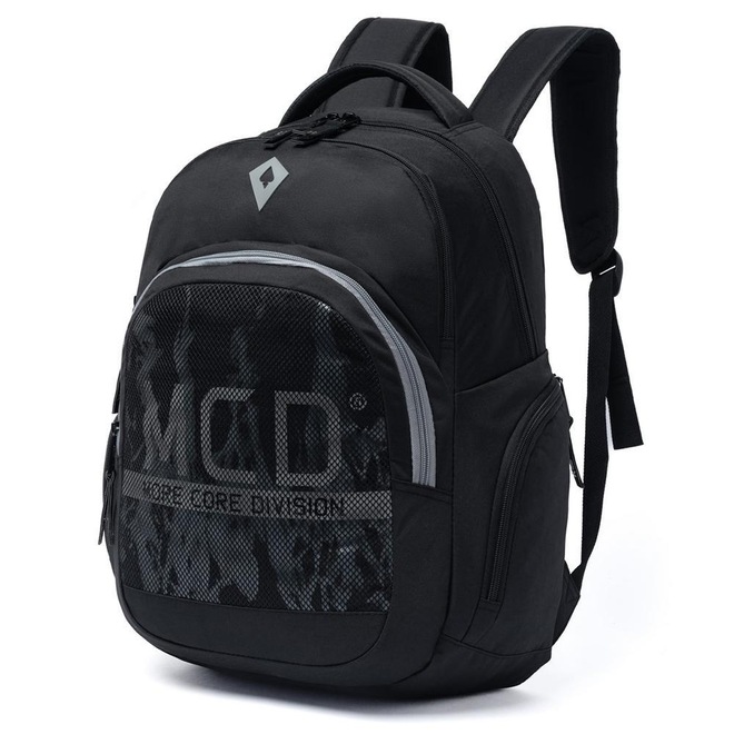 Mochila MCD com compartimento principal, compartimento frontal, espaço para notebook até 15,6", logo frontal e etiquetas personalizadas.