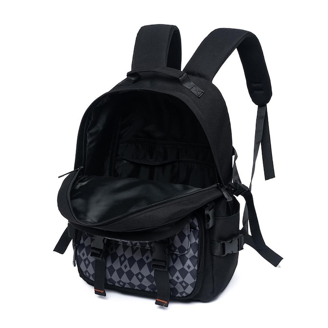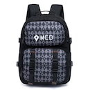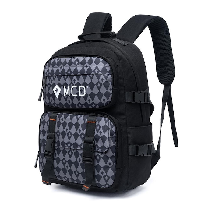 Mochila MCD com compartimento principal, compartimento frontal, espaço para notebook até 15", estampa frontal e etiquetas personalizadas.