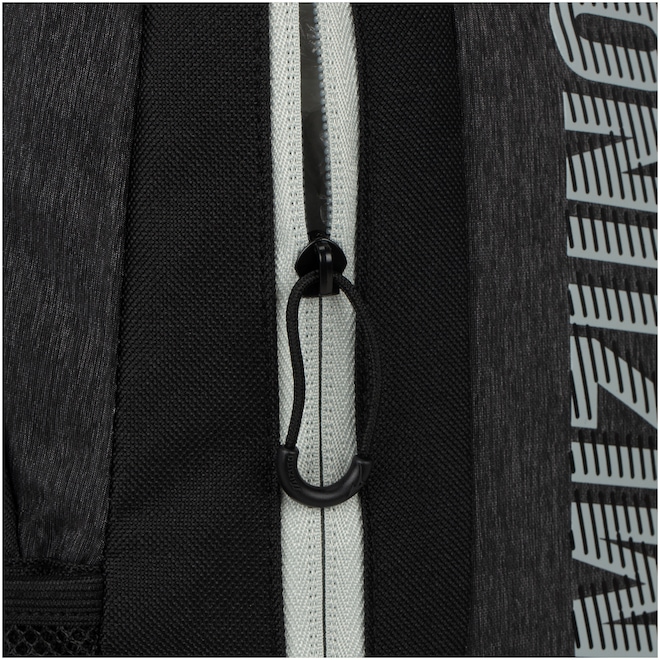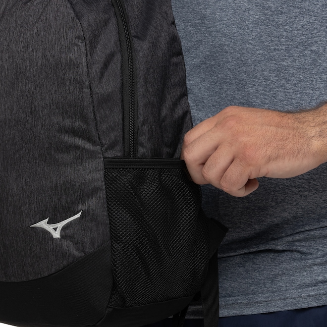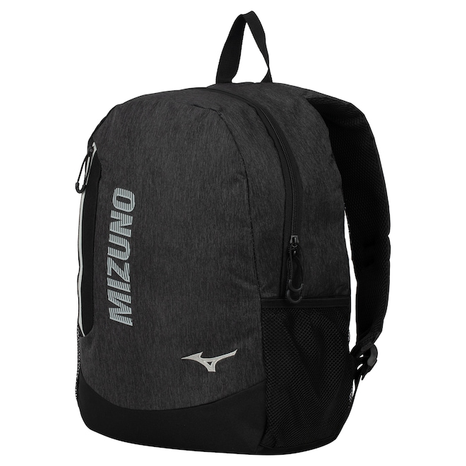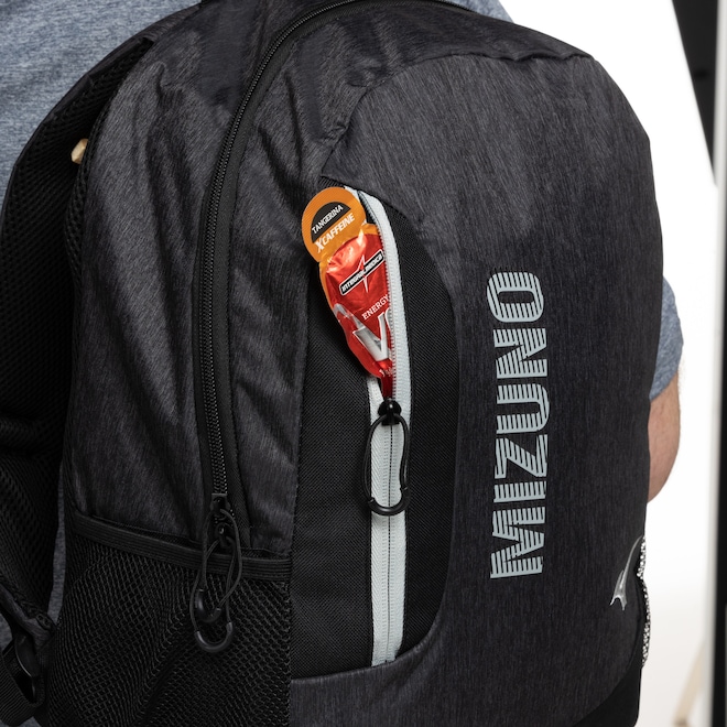 A mochila Mizuno conta com compartimento interno principal amplo com divisória e externo com bolsos laterais e bolso frontal em zíper.