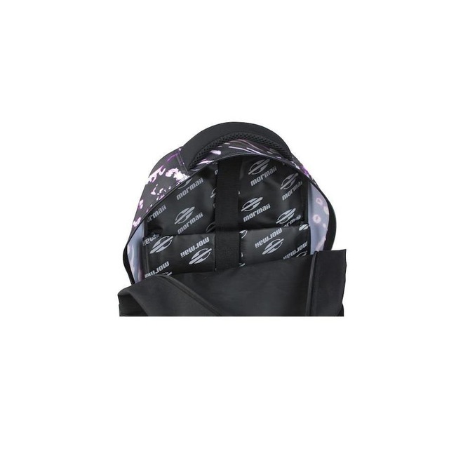Mochila Mormaii com alça manual em EVA reforçada, alças traseiras acolchoadas, costas reforçadas acolchoadas, zipper e logo em metal personalizado, multiplos compartimentos, compartimento para laptop e etiquetas personalizadas.
