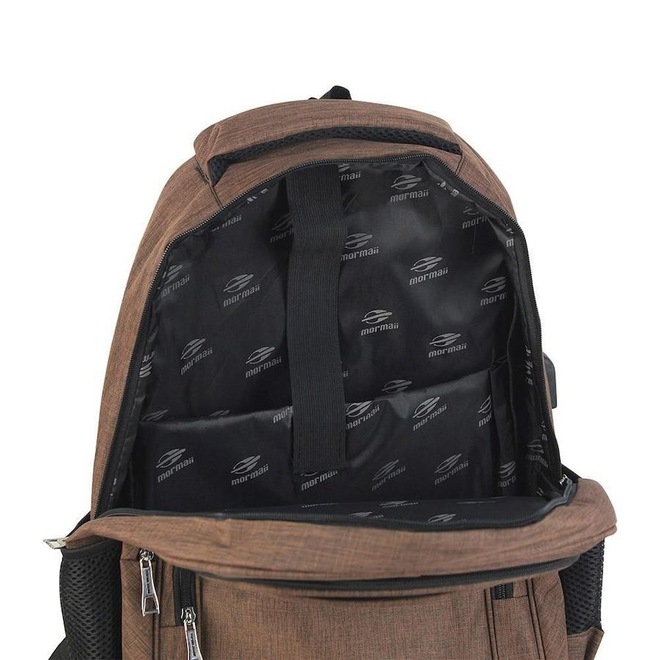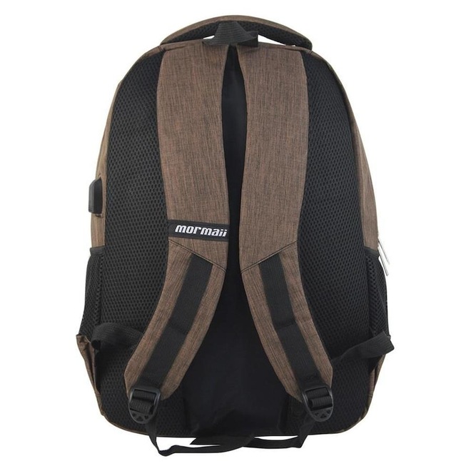 Mochila Mormaii com alça manual em EVA reforçada, alças traseiras acolchoadas, costura dupla reforçada, costas reforçadas acolchoadas, zipper em metal personalizado, multiplos compartimentos, compartimento para laptop e etiquetas personalizadas.