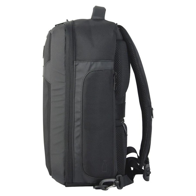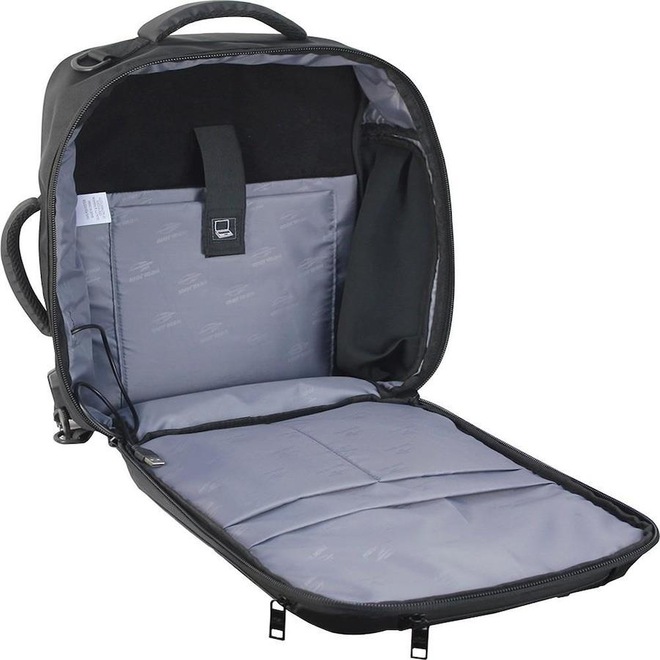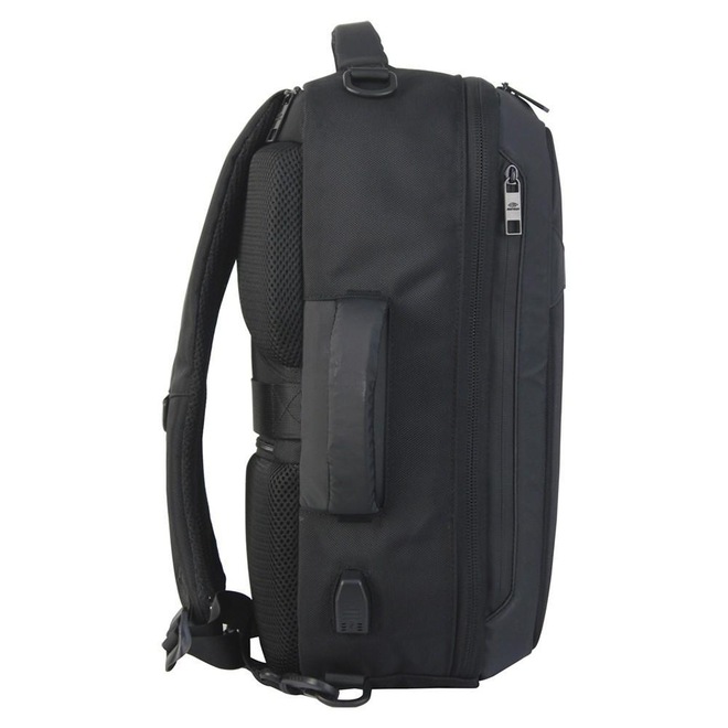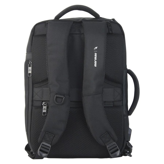Mochila Mormaii com saída USB, alça manual em EVA reforçada, alças traseiras acolchoadas, zipper e logo em metal, costas reforçadas acolchoadas, múltiplos compartimentos, compartimento para laptop e etiquetas personalizadas.