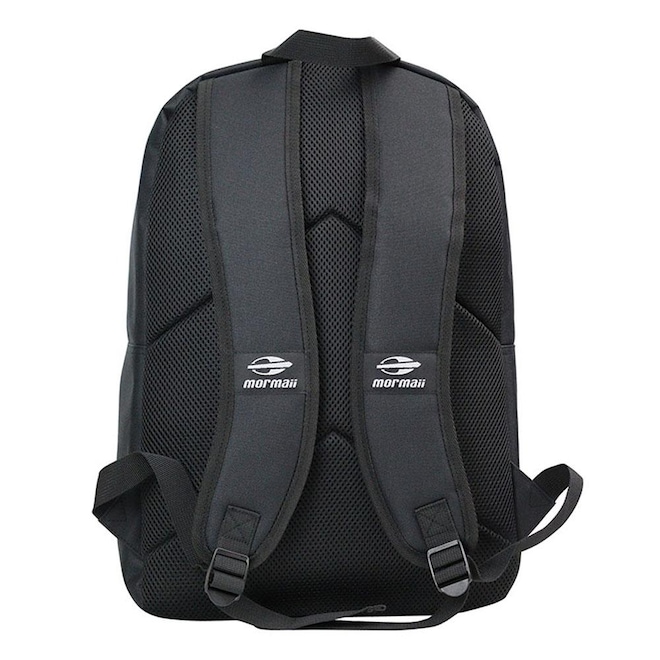 Mochila Mormaii com alças acolchoadas, alça manual reforçada, costas acolchada reforçada, costura dupla reforçada e etiquetas personalizadas.