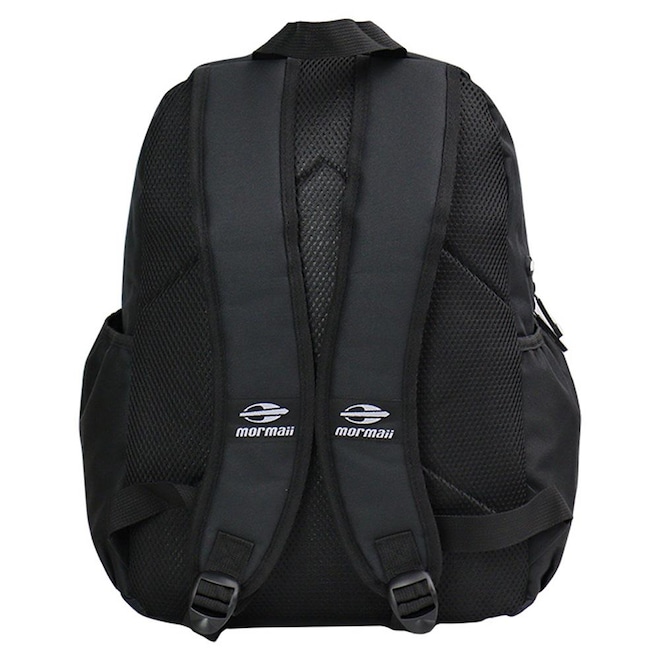 Mochila Mormaii com alças acolchoadas, alça manual reforçada, costas acolchada reforçada, costura dupla reforçada e etiquetas personalizadas.