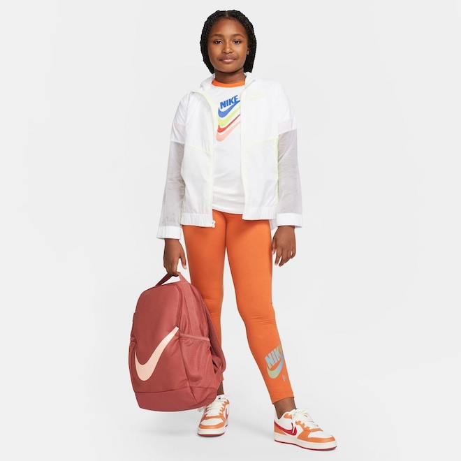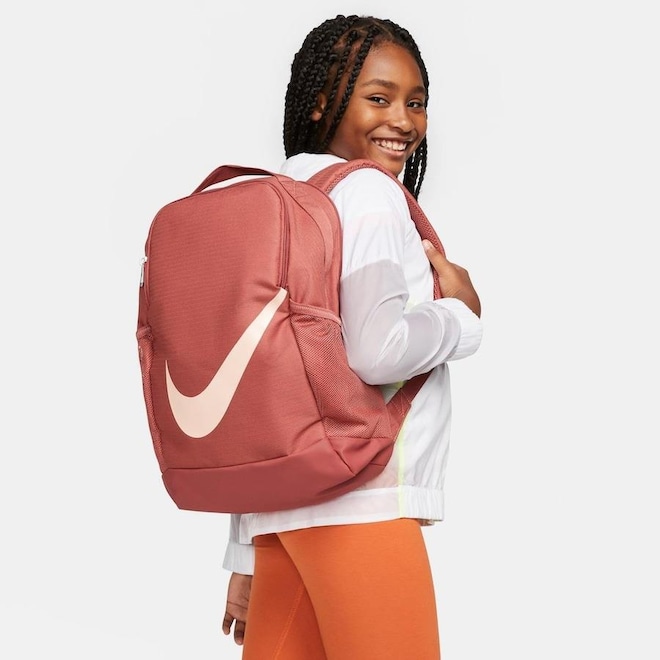 A mochila estampada Nike Brasilia está pronta para a sala de aula com um compartimento principal para guardar livros e material escolar.
