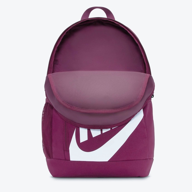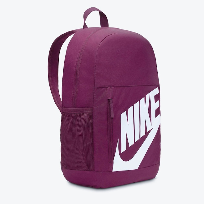 A Mochila Nike Elemental oferece 20 litros de capacidade em um compartimento principal espaçoso, ideal para livros, cadernos e itens maiores.