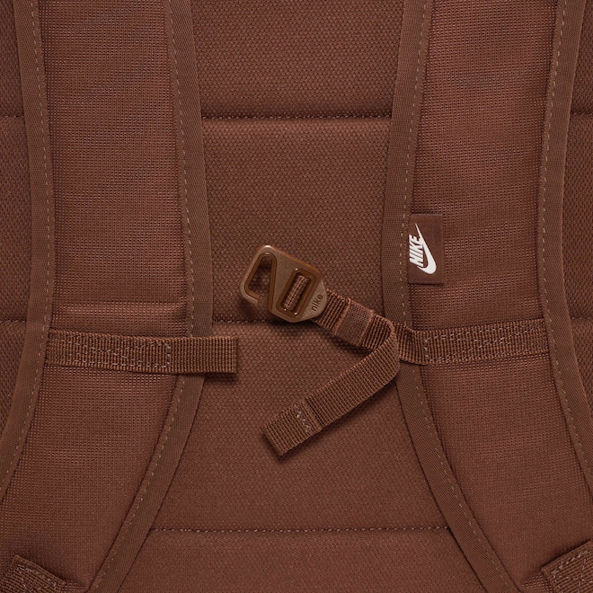 A mochila Nike possui capacidade de 25 litros, fechamento em zíper, compartimentos interno amplo e com divisória para notebook, e externamente tem bolsos em zíper.