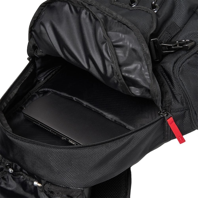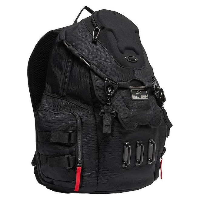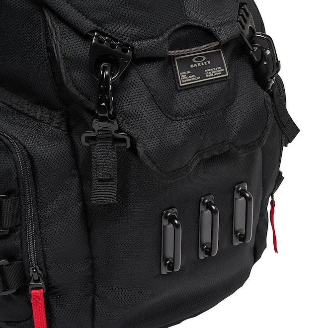Mochila Oakley com compartimento principal com entrada lateral com zíper, vários bolsos especializados, capa interna acolchoada para laptop de 15", painel traseiro moldado por compressão para prender, alças de ombro acolchoadas de tecido escovado ajustáveis e fivela de clipe, bolso dedicado para óculos de proteção mantém os óculos seguros e protegidos, bolso para mídia escovado na tampa, acabamentos e detalhes em metal pesado, detalhes do logotipo Oakley Ellipse em metal e fundo reforçado oferece durabilidade estruturada.