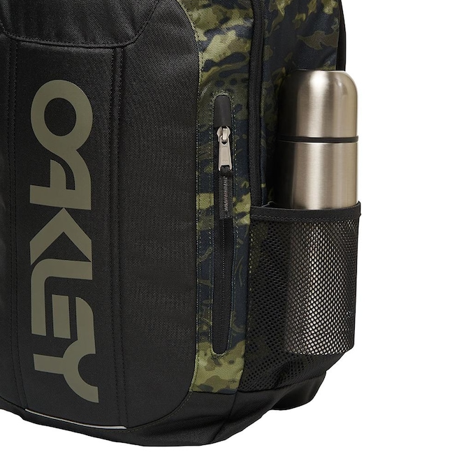 Mochila Oakley impermeável, compartimento interno acolchoado para laptop de 15", bolso frontal com zíper para itens essenciais, alças de ombro e painel traseiro acolchoados, bolso acolchoado para óculos e detalhes refletivos.