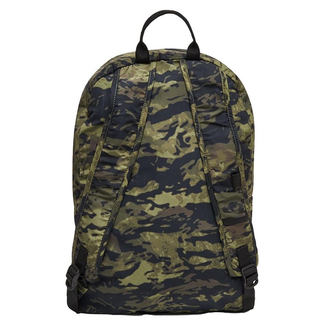 Mochila Oakley com bolso frontal para dobrar e guardar a mochila, sistema de laço para guardar óculos na alça esquerda, alças de ombros ajustáveis e acolchoadas em malha, sistema de zíper duplo, logo Oakley Elipse na frente e nas alças de ombro, logo Oakley Elipse no bolso dobrável e bolso organizador interno.