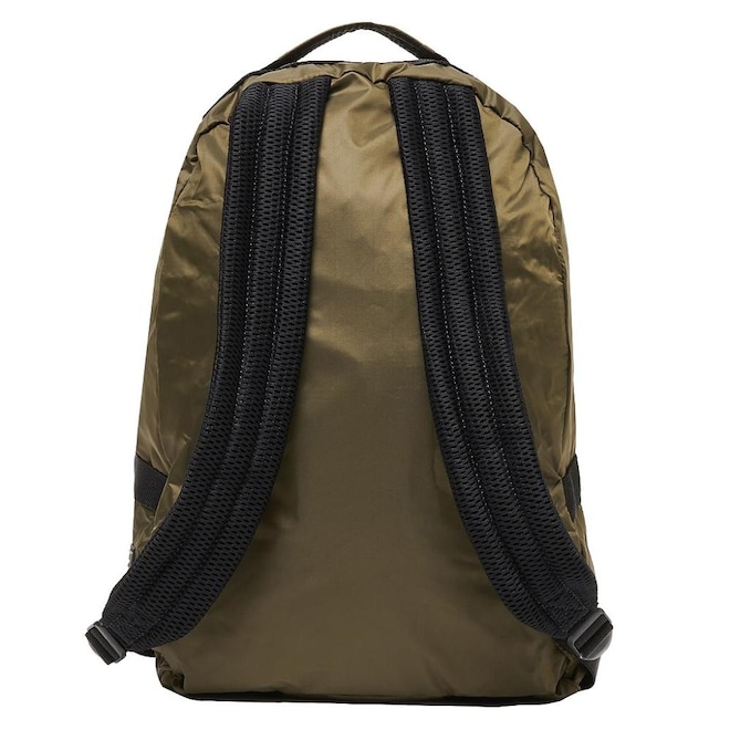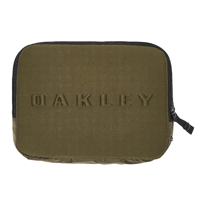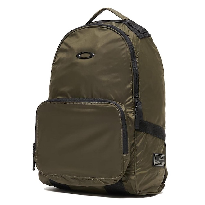 Mochila Oakley confeccionada em nylon reciclado, durável e repelente à água, alças de ombro ergonômicas para transporte confortável, patch Oakley Ellipse em TPU com a marca, bolso reforçado em neoprene para proteção adicional e função compactável com marca em relevo Oakley Bark na frente.