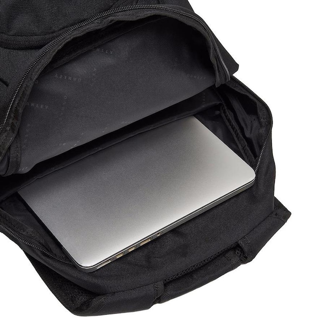 Mochila Oakley com alças acolchoadas de malha ajustável, dois compartimentos principais: um dedicado para laptop e tablet e um com bolsos de organização. Bolso frontal com zíper para itens essenciais. Bolsos laterais. Logotipo elipse Oakley em silicone na frente. Forro de marca.
