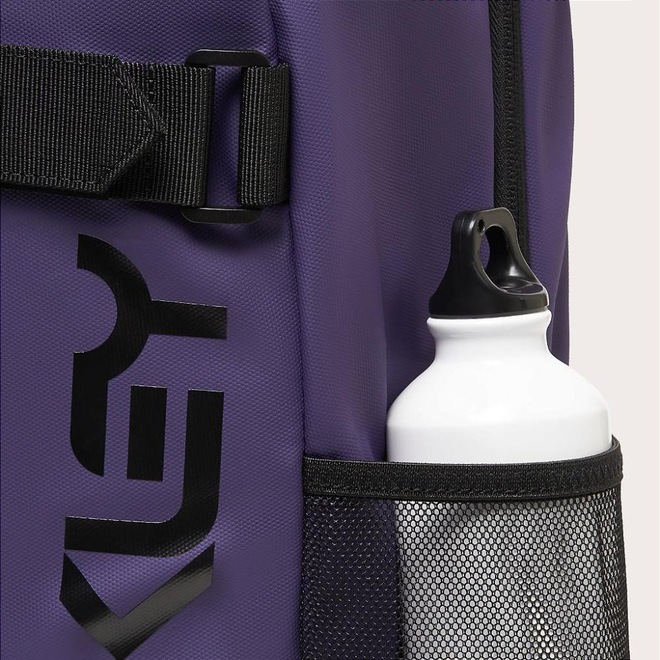 Mochila Oakley com alças de ombro ajustáveis acolchoadas em mesh para conforto, sistema de alça para óculos no ombro esquerdo, painel traseiro estruturado em mesh moldado para respirabilidade, compartimento principal com divisória para laptop, cinta de cintura ajustável com fecho de fivela, bolso frontal com zíper para armazenamento adicional, bolsos laterais em mesh, alças ajustáveis na frente para transportar skate, logo Oakley B1B na frente e na alça de ombro, fundo reforçado e tecido resistente à água para maior durabilidade.