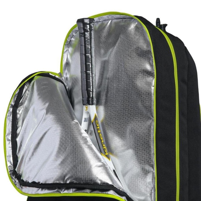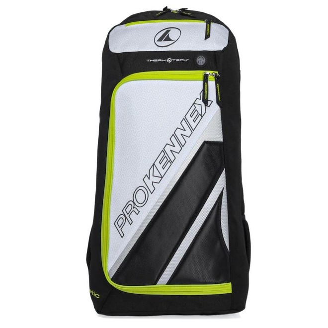 - Detalhamento: Dois compartimentos principais, sendo um deles térmico, com capacidade para até 6 raquetes de tennis sem capa, compartimento frontal amplo com divisória e um bolso pequeno para melhor acomodação de seus itens, um bolso menor na regial superior, compartimento para acomodar um par de calçados ou roupas úmidas, bolsos laterais em tecido mesh, bolso traseiro acolchoado, alças acolchoadas ajustáveis. Saída emborrachada para fones de ouviso;