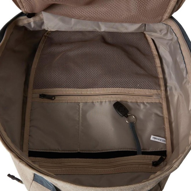 Mochila de lona bicolor com alça pequena superior em material não natural com alças de ombro acolchoada, 1 compartimento principal grande com compartimentos para acessórios, bolso interno de malha deom zíper para laptop, bolso dedicado para acessórios, bolsos laterais com encaixe, bolso de malha externo, etiqueta em material não natural, com etiqueta de bandeira e etiquetas personalizadas.