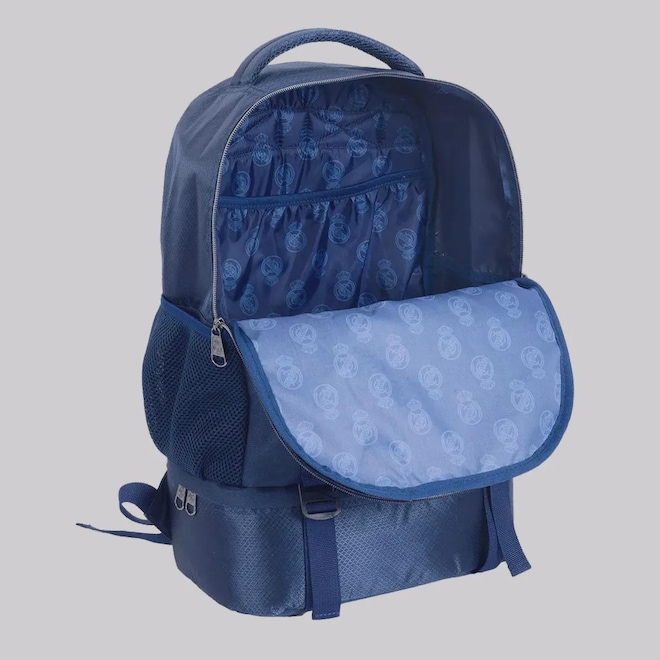 Dimensões aproximadas (A x L x P): 43 x 30 x 15 cmAlças: Uma de mãos e duas para os ombrosAbertura/fechamento: Zíper bidirecionalCompartimento: Um principal amploBolsos: Um frontalComposição: 100% PoliésterCor predominante: MarinhoPeso aproximado: 490 gIndicado para: CasualPorta-notebook: SimPorta-garrafas: SimPorta-tênis: SimEscudo: EstampadoClube: Real MadridOrigem: NacionalGênero: UnissexTamanho único