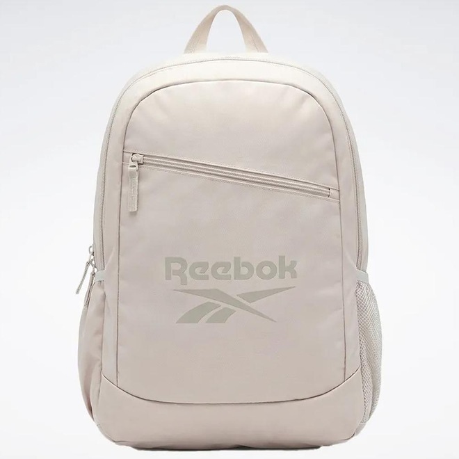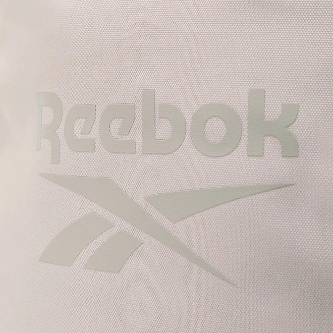 Mochila Reebok com compartimento principal, compartimento na parte frontal, estampa frontal, alças ajustáveis, espaço para laptop e etiquetas personalizadas.