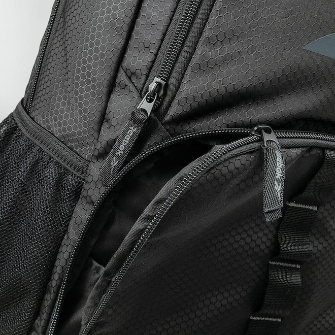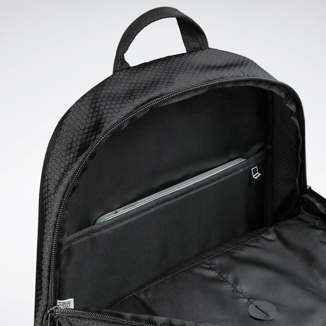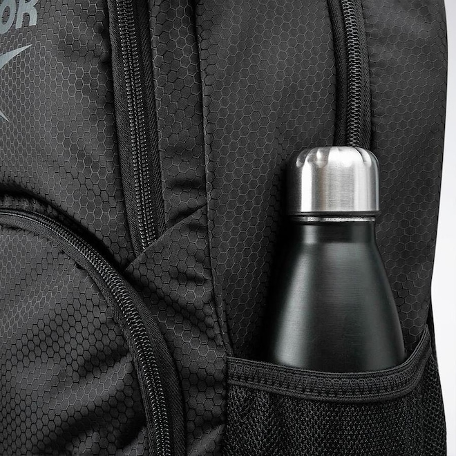 Mochila Reebok esportiva santa fé, bolso frontal, bolsos latereais em tela e etiquetas personalizadas.