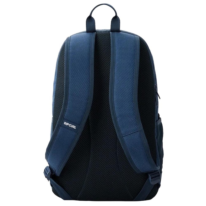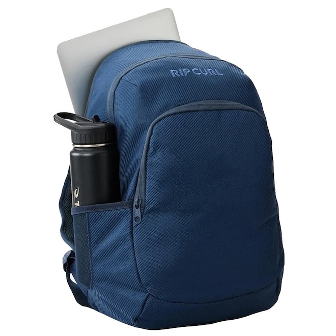 Mochila Rip Curl com grande seção principal, alças ajustáveis, compartimento para notebook de até 13", vários organizadores e bolsos utilitários, bolso para garrafa de bebida, alças de mochila respiráveis e logotipos variados.