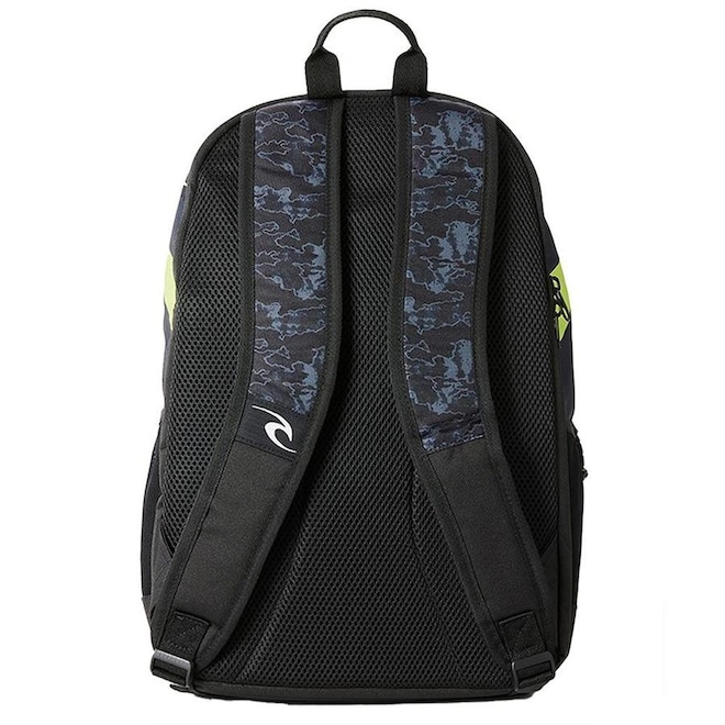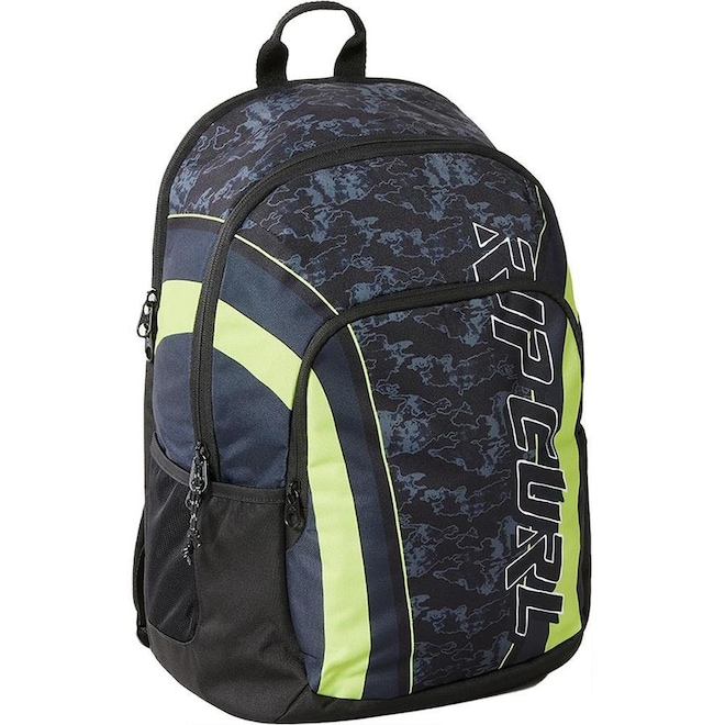 Mochila Rip Curl com seção para laptop, grande seção principal, vários bolsos organizadores e utilitários, bolso para garrafa de bebida e etiquetas personalizadas.