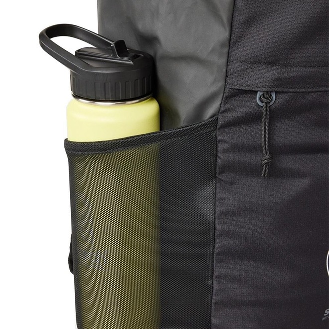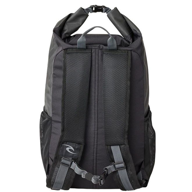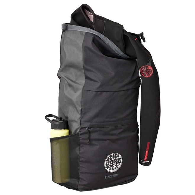 Mochila Rip Curl com construção totalmente selada, sistema Roll and Chip - seção molhado/seco, bolsos para garrafas e bolso frontal com zíper.
