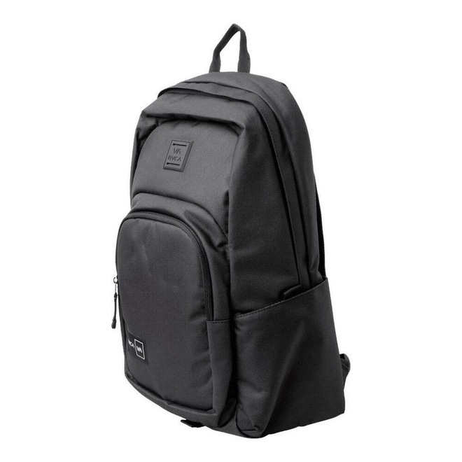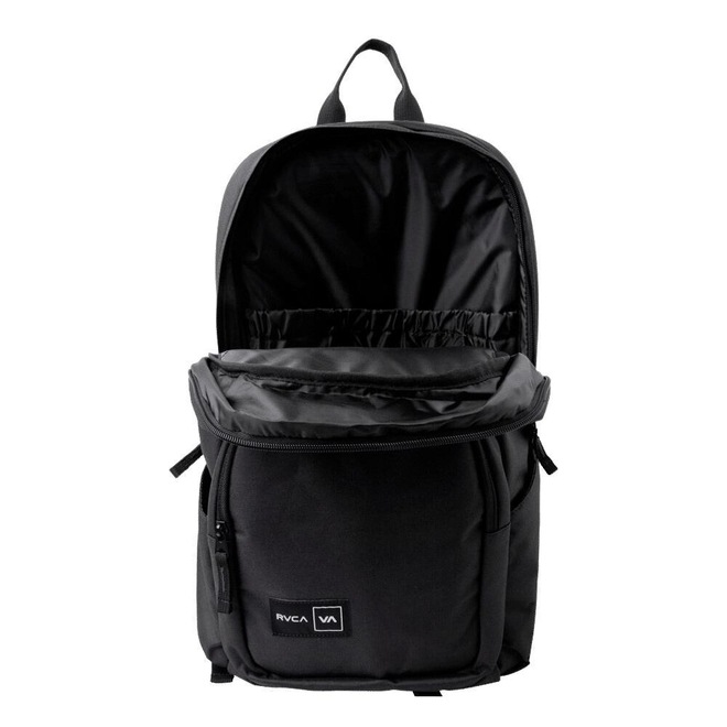 Mochila RVCA feita em tecido poliéster reciclado, dois compartimentos com zíper, compartimentos laterais em malha mesh, organizador interno do bolso frontal, alças de ombro ajustáveis, recorte de malha mesh traseira com arte rvca pespontada e etiquetas rvca va frente