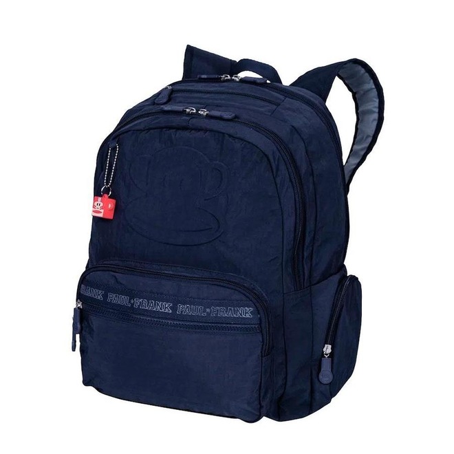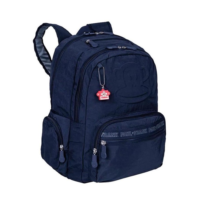 Produzido em Náilon, um material resistente, possui alças de costas espumadas, para maior conforto dos ombros, além alça de mão, pra facilitar o transporte. Este modelo tem bolsos laterais com fecho zíper e um bolso frontal bem prático. Além disso, tem um bolso de fácil acesso, com zíper, para que você possa ter pequenos objetos sempre à mão. Você ainda ganha um chaveiro do simpático macaquinho Julius para enfeitar sua mochila.