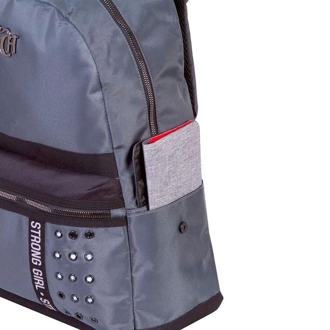 Com Alça das Costas Espumadas e Bolso Lateral com Tampa. Produzida em Poliéster, um material resistente.