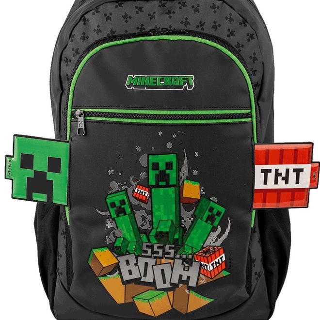 A mochila grande Minecraft Icons oferece durabilidade, estilo e muito espaço para o dia a dia, com dois compartimentos principais, bolso frontal e bolsos laterais em tela. Possui alça de mão e alças de costas espumadas e reguláveis, tag identificadora, logo em metal e fechamento com zíper. É a escolha ideal para fãs do jogo que buscam praticidade com personalidade.