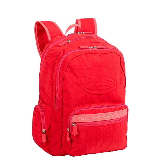 A Mochila Grande Paul Frank T03 Cereja é resistente e confortável! Feita em Crinkle Náilon, possui alças espumadas, alça de mão, bolsos laterais e frontais com zíper. Acompanha chaveiro do macaquinho Julius (modelos sortidos).