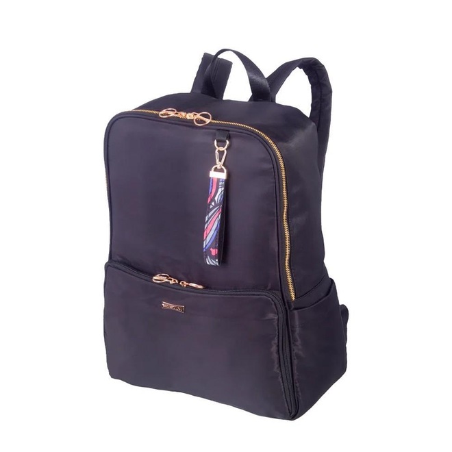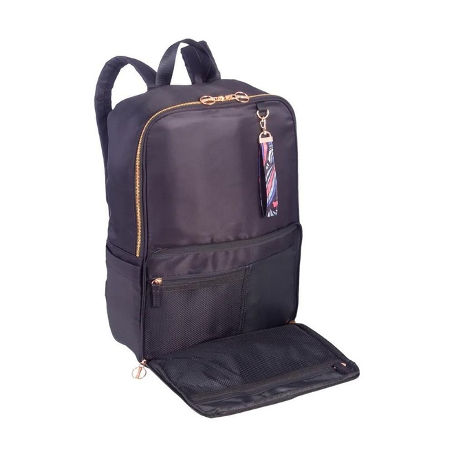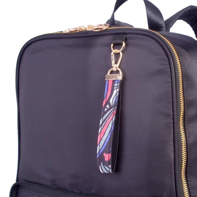 Feita em poliéster, tecido resistente e com toque macio, vem ainda com um lindo chaveiro com nova estampa e puxadores em dourado.