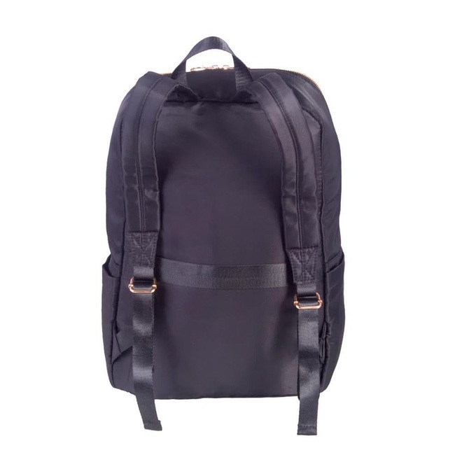 O bolso lateral e o frontal, com zíper, ajuda a organizar itens pessoais e periféricos.