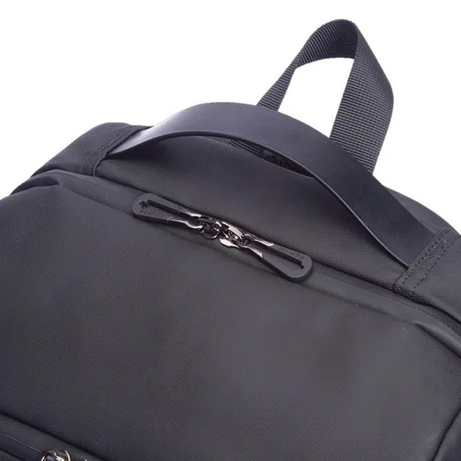 Até mesmo os detalhes do zíper recebem uma proteção emborrachada para evitar que a água penetre nos fechos, assim como a alça de mão.