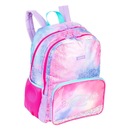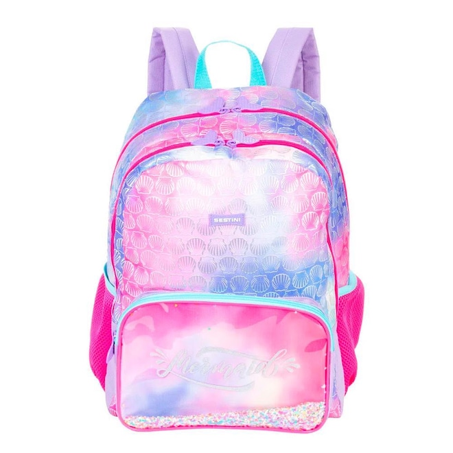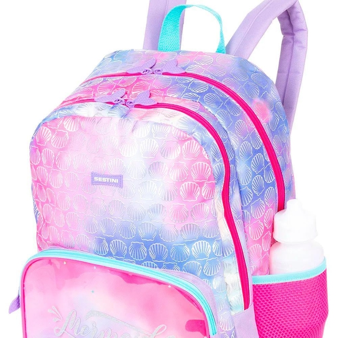 Logo de cara, a estampa metalizada do painel frontal e lateral chama a atenção, cheia de conchas. Os puxadores tem formato da cauda das sereias. E no bolso da frente, confetes se movem como areia na praia. A versão com alça de costas e reforço na costura tem dois compartimentos, perfeito para separar materiais e organizar os pertences da criança.