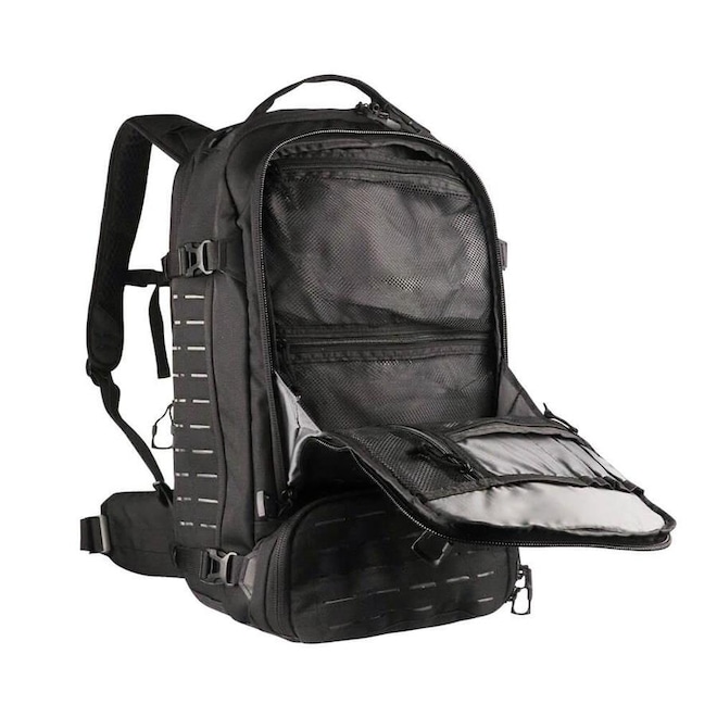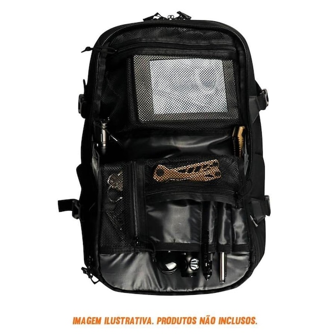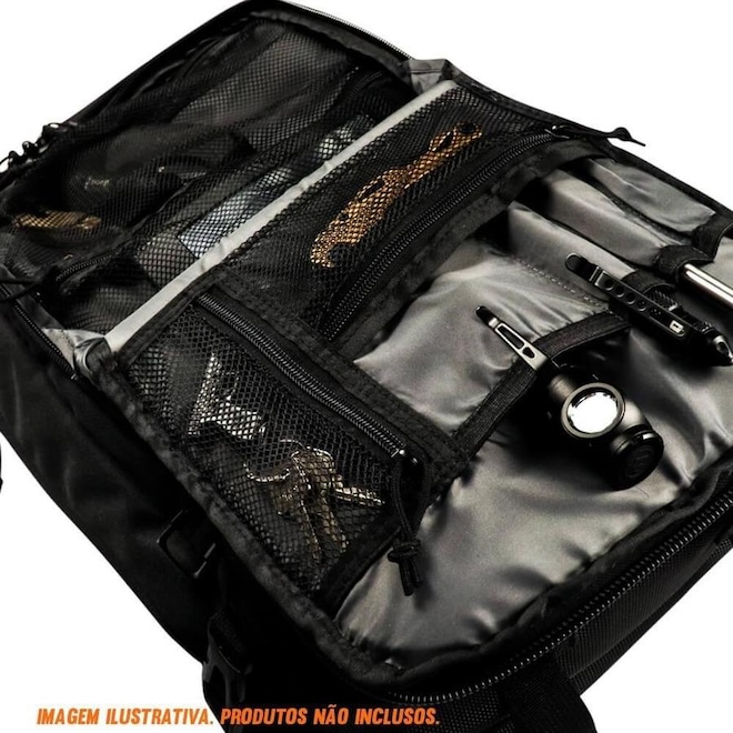 Fabricada em tecido poliéster 1000 D resinado em PVC, ela é resistente à água, possui painel frontal com sistema MOLLE Laser Cut dublado e 7 compartimentos com múltiplos bolsos, além de tecido aderente para fixação de patches. Ainda, ela conta com zíperes duplos com puxador anatômico, bolso frontal porta-óculos.