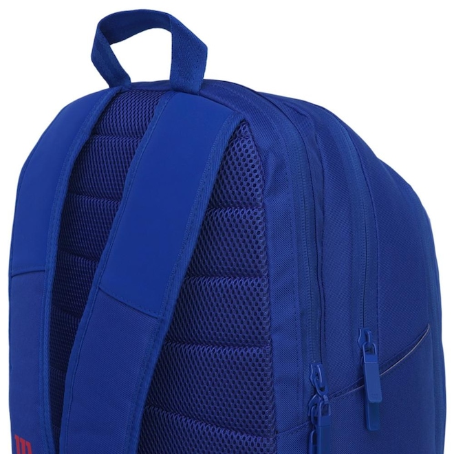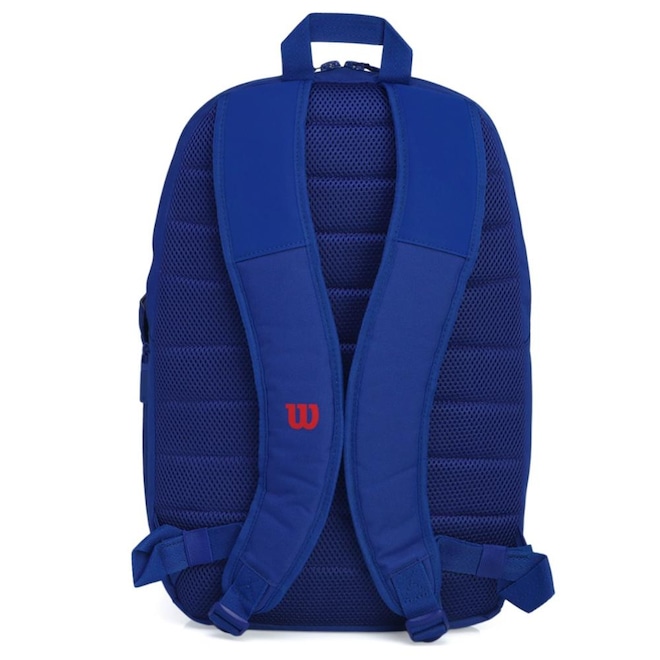 - Detalhamento: Compartimento traseiro com zíper, com capacidade para até duas raquetes. O compartimento principal é espaçoso e conta com uma manga acolchoada para proteger o laptop. Nas laterais, há dois bolsos com expansão elástica, ideais para garrafas de água ou latas de bolas. Na parte da frente, um bolso ventilado permite armazenar sapatos ou roupas sujas separadamente. Também conta com um bolso frontal pequeno com zíper, perfeito para itens menores ou de fácil acesso. As alças acolchoadas e ajustáveis garantem conforto e praticidade no transporte. Escrita Wilson em destaque na parte frontal;