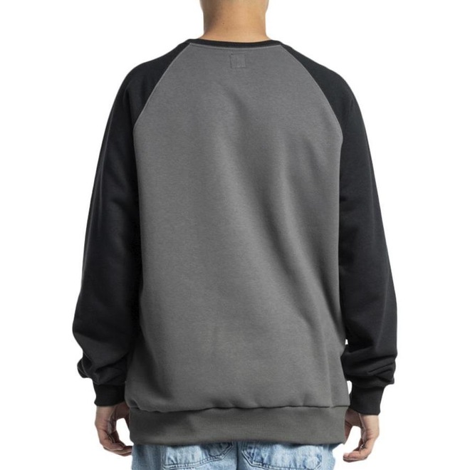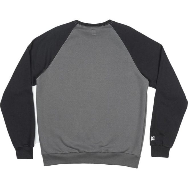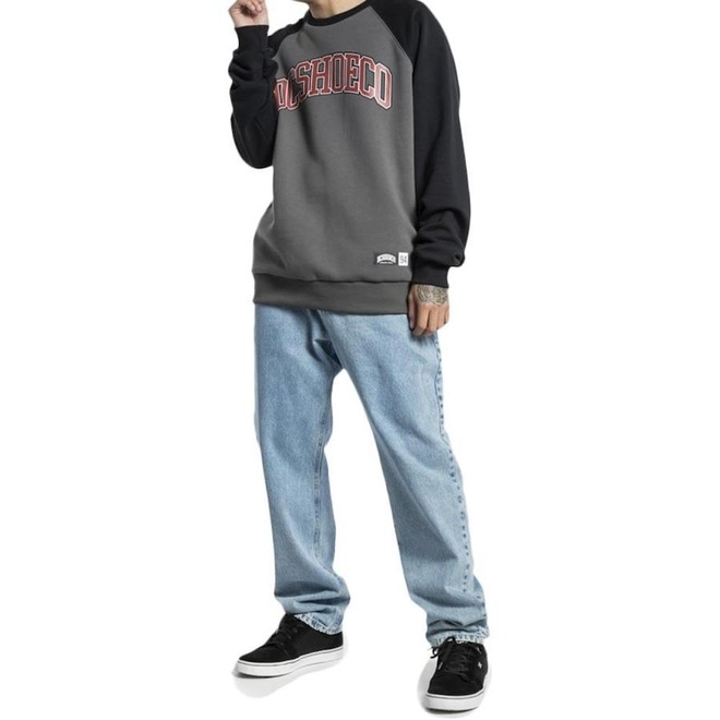 Moletom DC Shoes de gola careca, cava raglan contrastante, estampa frontal, estampa na parte inferior, estampa na manga e etiquetas personalizadas.