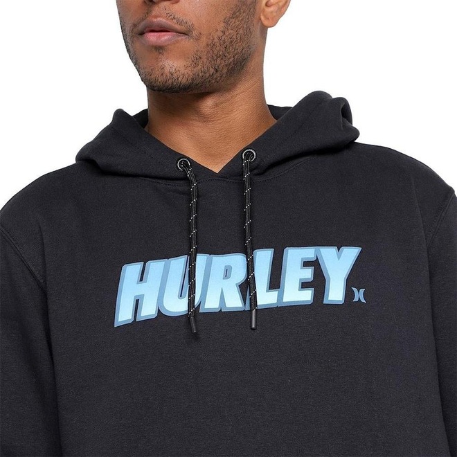 Moletom Hurley com bolso canguru, capuz com cordão ajustável, estampa frontal e etiquetas personalizadas.